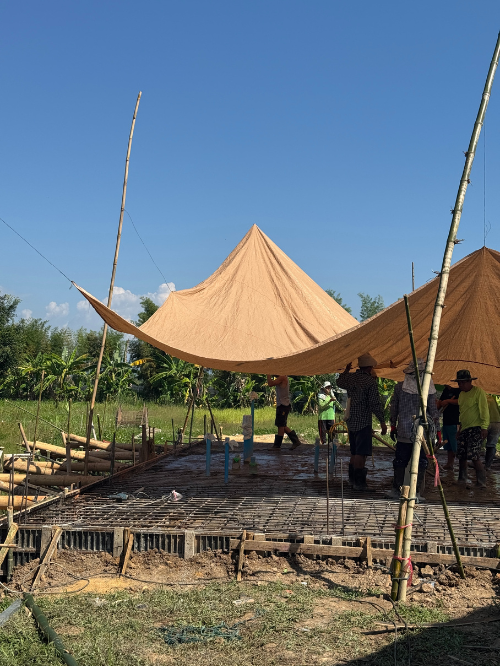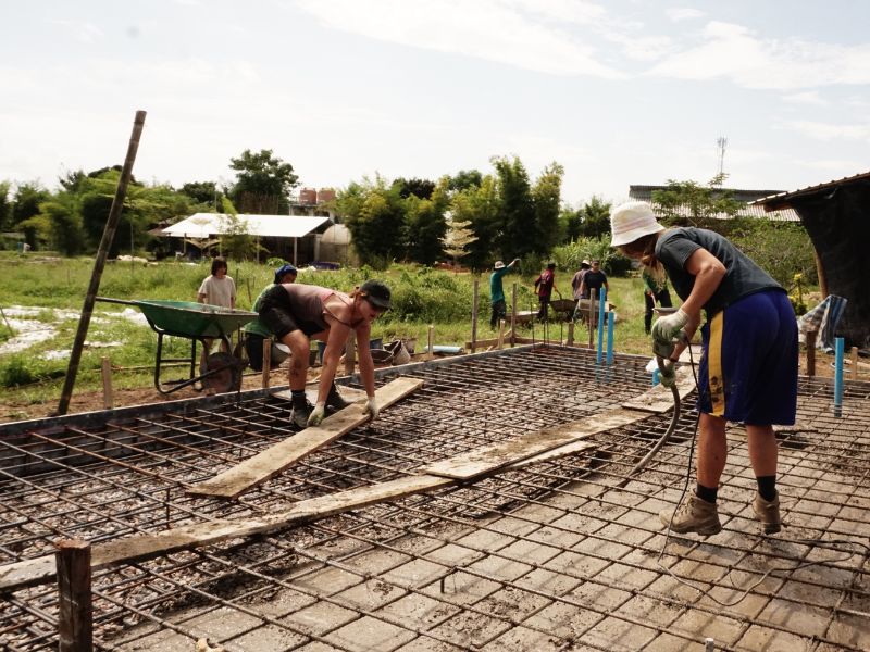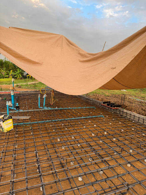 When constructing our clay houses, we started with the foundation, we chose a concrete foundation with steel. After laying the pipes underground the foundation can be poured and soon the floor can be sanded.