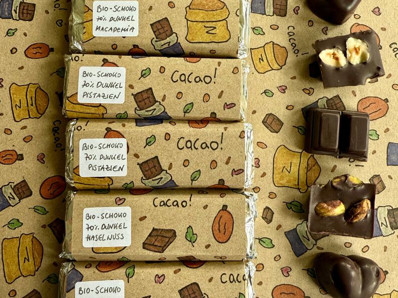 In 2023 we received a piece of land with many cacao trees (Theobroma cacao) and wondered what we should do with all the cacao pods. Our curiosity sparked a learning journey at local artisan chocolate makers. We learned step by step, how to turn the cacao beans into organic chocolate. Every part of the process is carefully done by hand – we care for the trees by fertilizing and pruning them, harvest the pods, ferment, dry, roast, peel and then the ready cacao beans are turned into milk and dark chocolate. At the farm café we offer organic milk and dark chocolate bars. Also, our farm products like brownies and cookies are refined by our organic homemade chocolate.